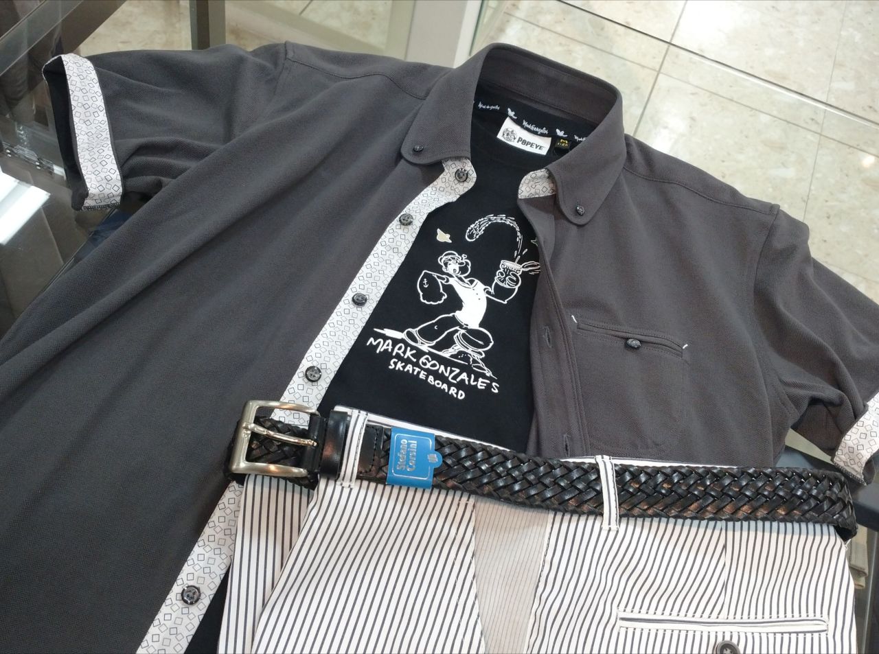 チャコールグレーのポロシャツを羽織りとして、ポパイのプリントTシャツ(ブラック)に合わせてみました♪