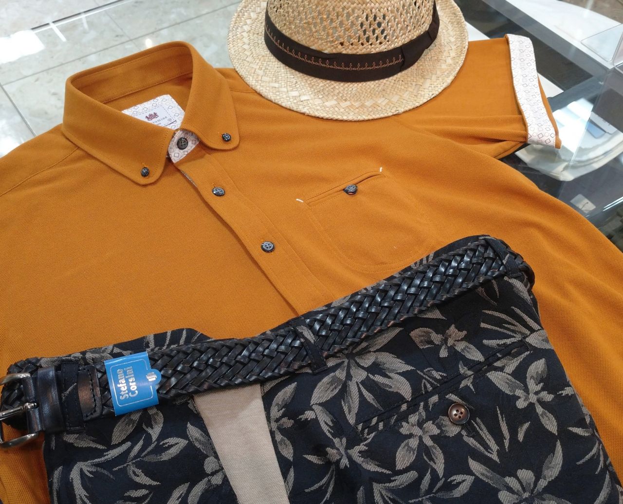 マスタードのポロシャツを、ゴブランフラワージャガードのショーツ(チャコール)に合わせ、