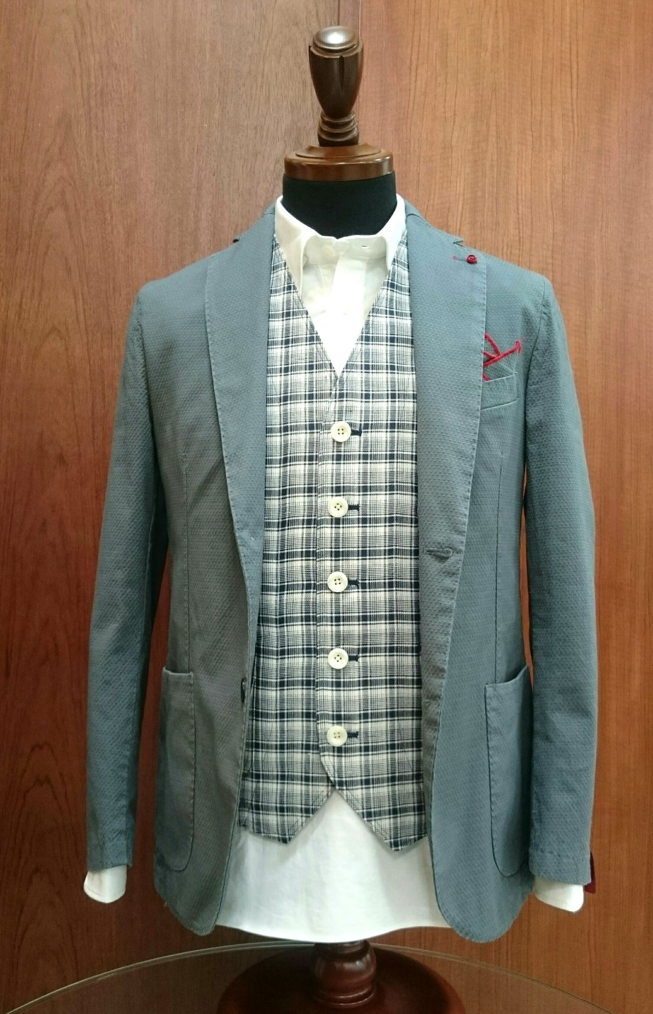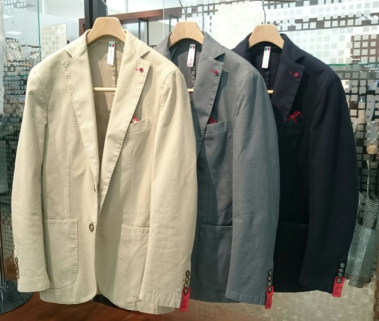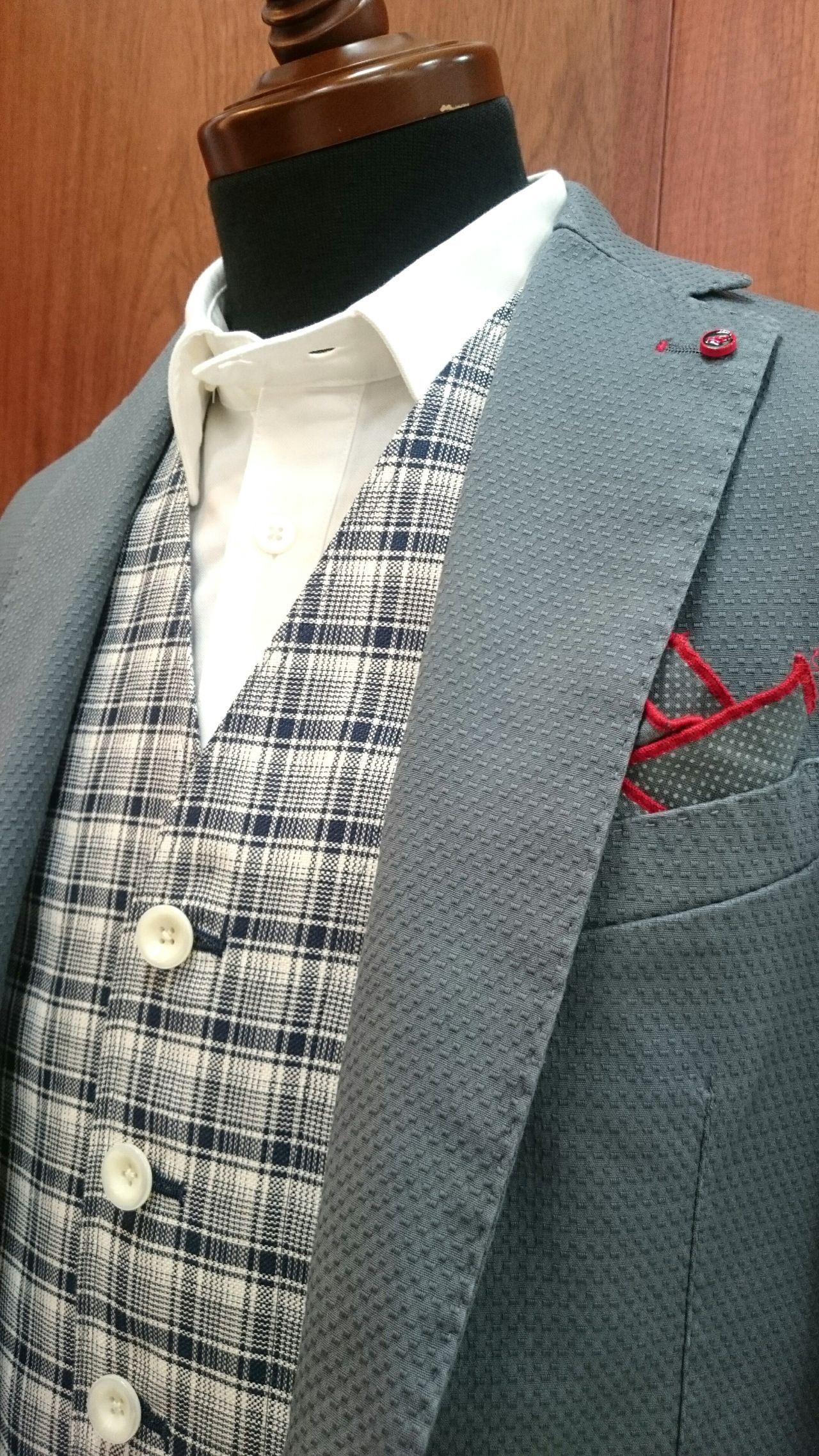 ポケットチーフの赤い縁取りがコーデのポイントになっています(^^)/♪