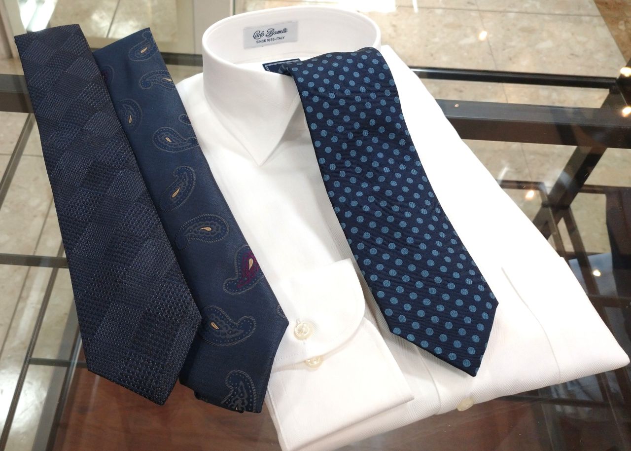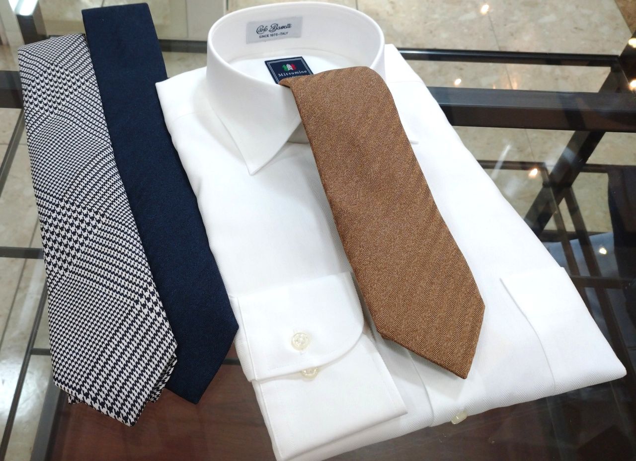 セミワイドのドレスシャツを合わせることで、ネクタイの派手さを抑え、上品にまとめることができます。