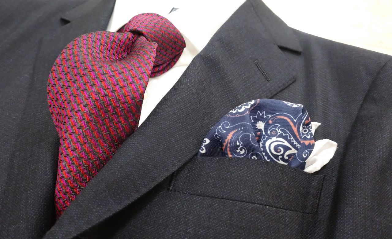 ダークネイビーのスーツと相性が良い、エンジ色がベースのネクタイを合わせてみました。