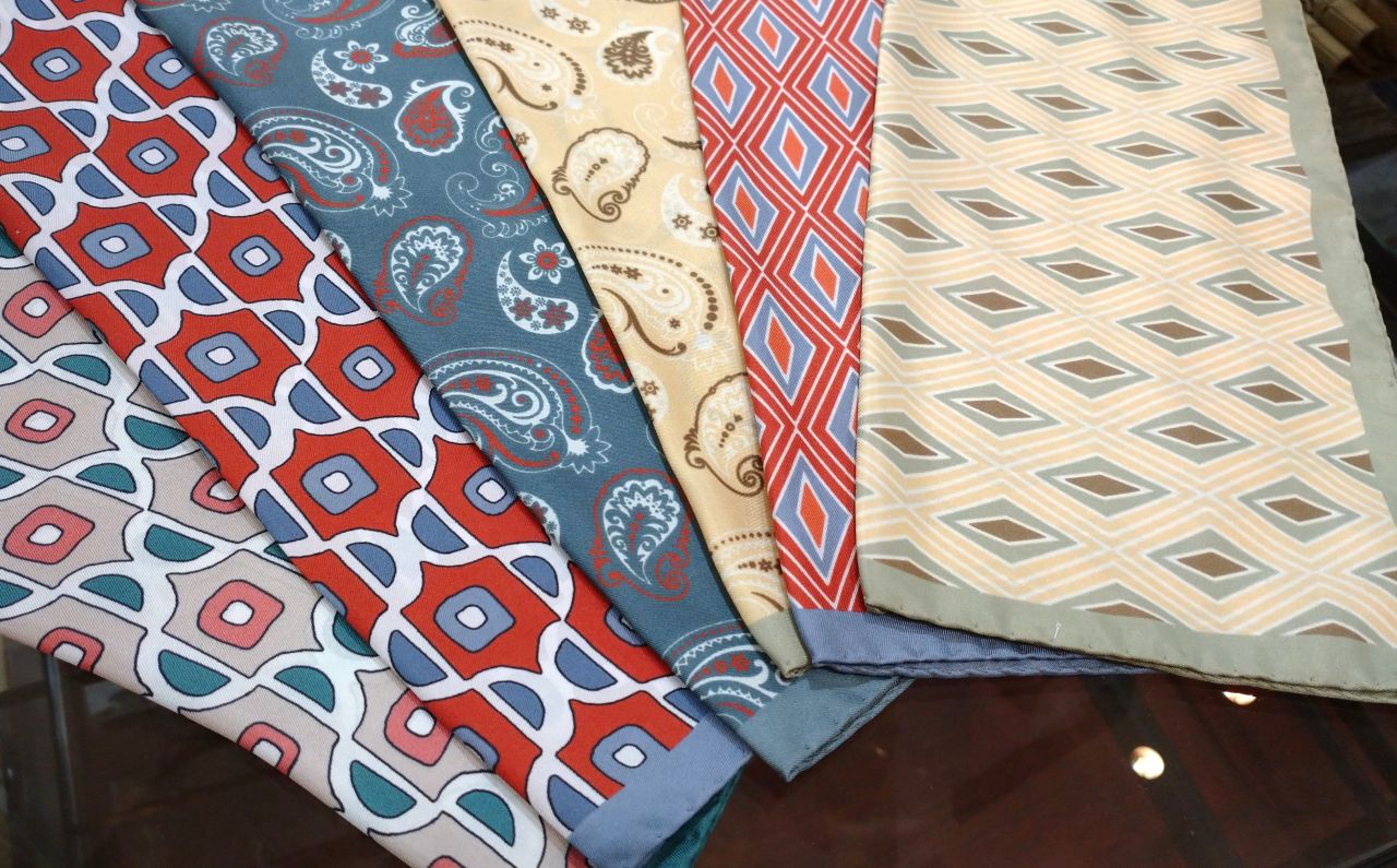 幾何学柄やペイズリーなど、レトロな配色のデザインが今年らしいポケットチーフです(*^^*)