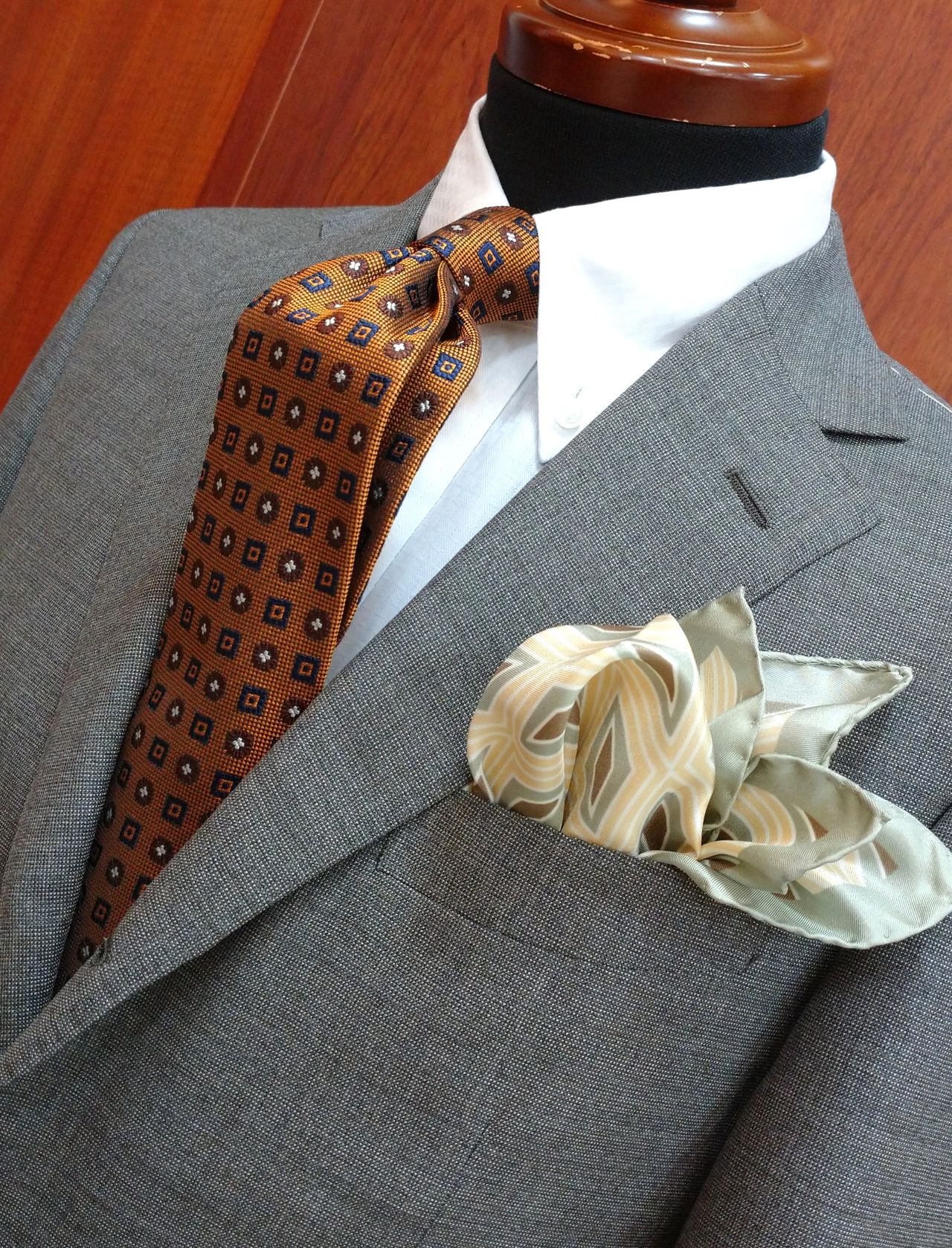 マスタードカラーの小紋柄ネクタイと、ベージュのポケットチーフを合わせました(^^)/♪