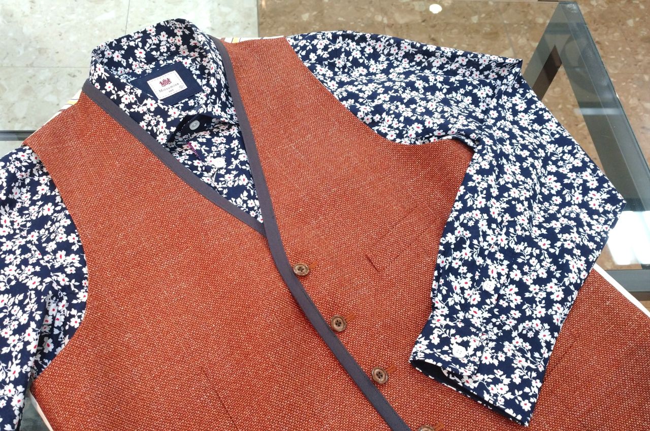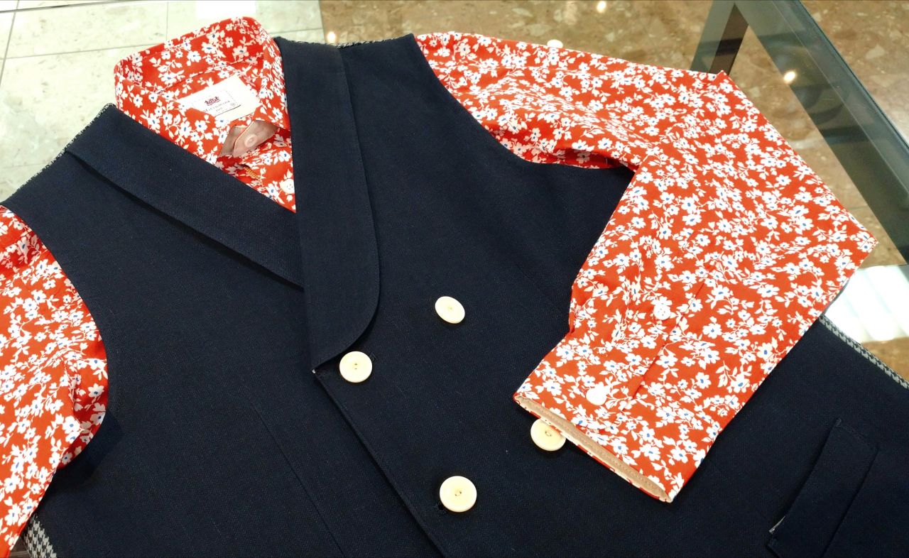 オレンジにはネイビーのショールカラーダブルベストを合わせました(^^)/