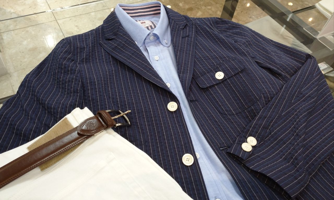 ネイビーベースにホワイトとブルーの細めのストライプが爽やかな印象です♪