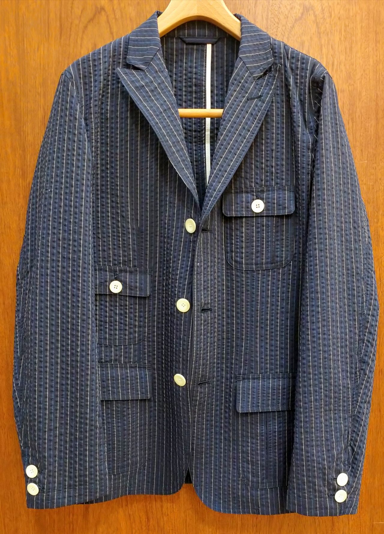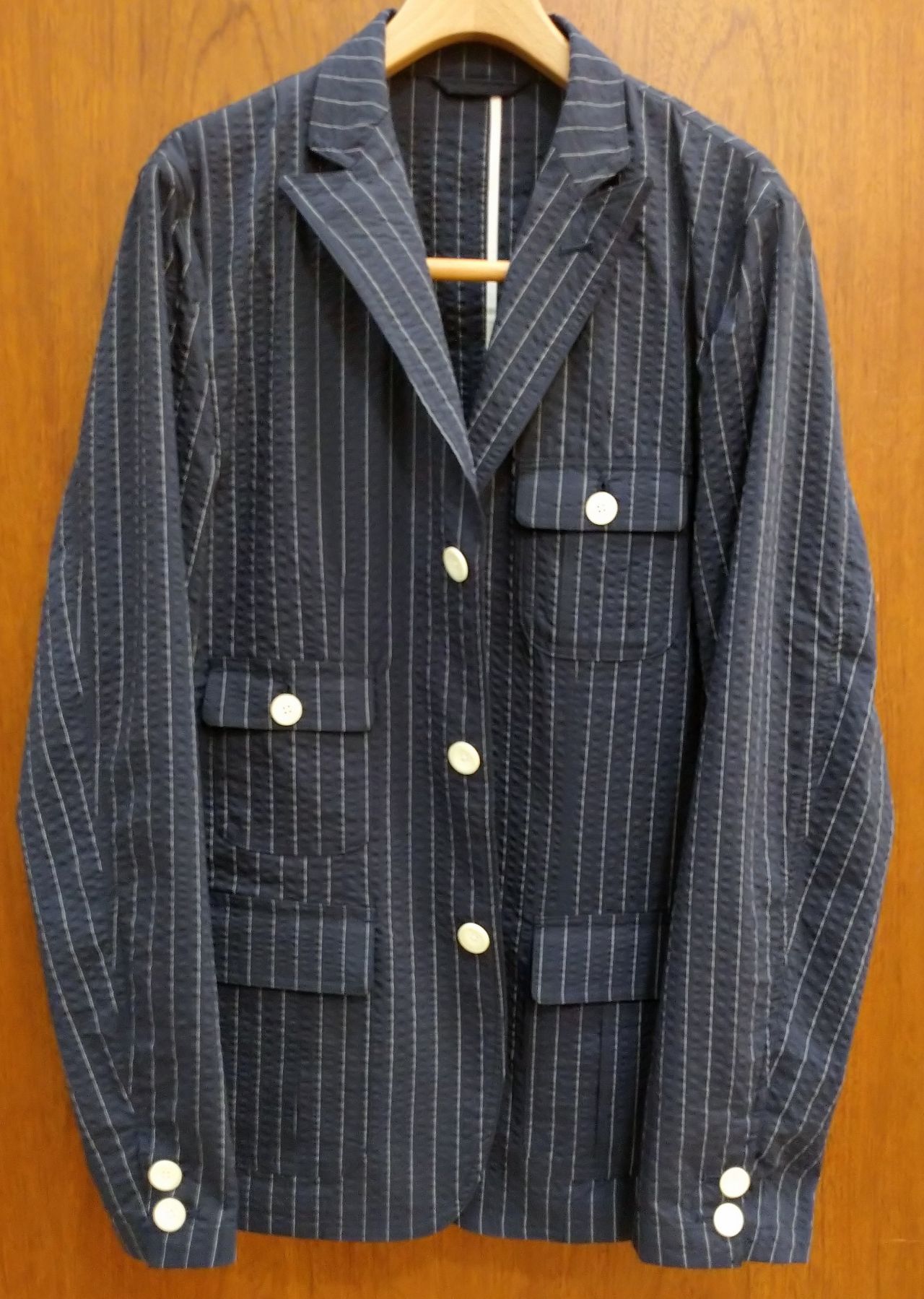 こちらは先ほどより少し暗めのネイビーに、ホワイトのストライプ、