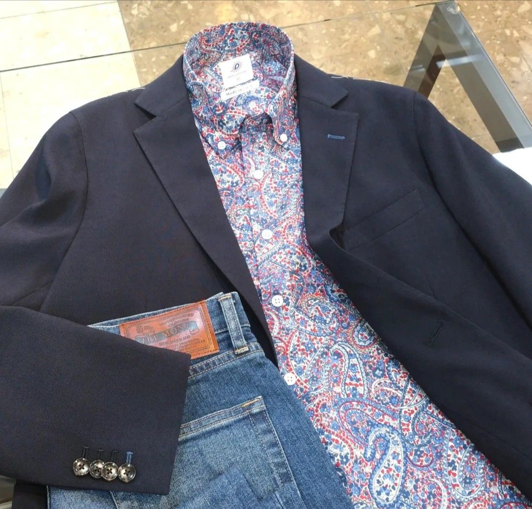 ブルーのデニムパンツとネイビーのニットジャケットで