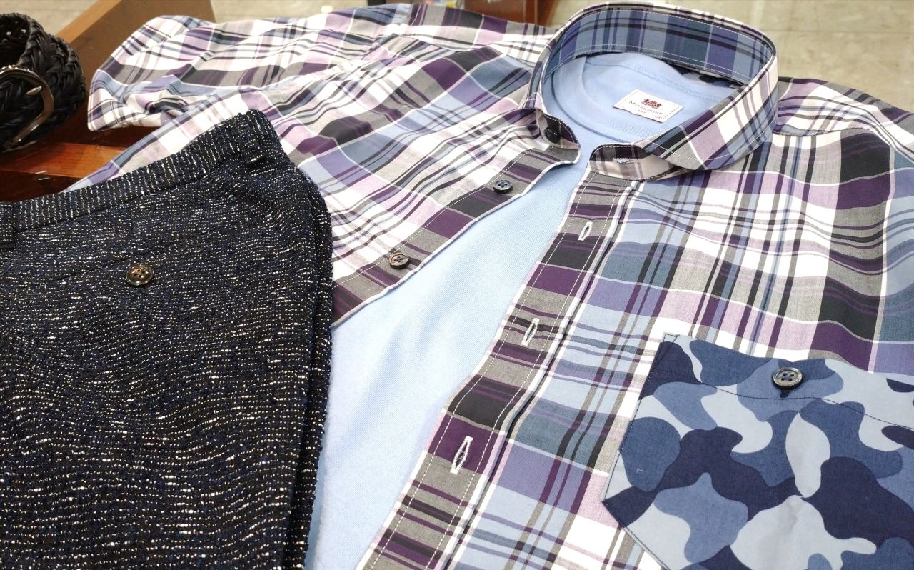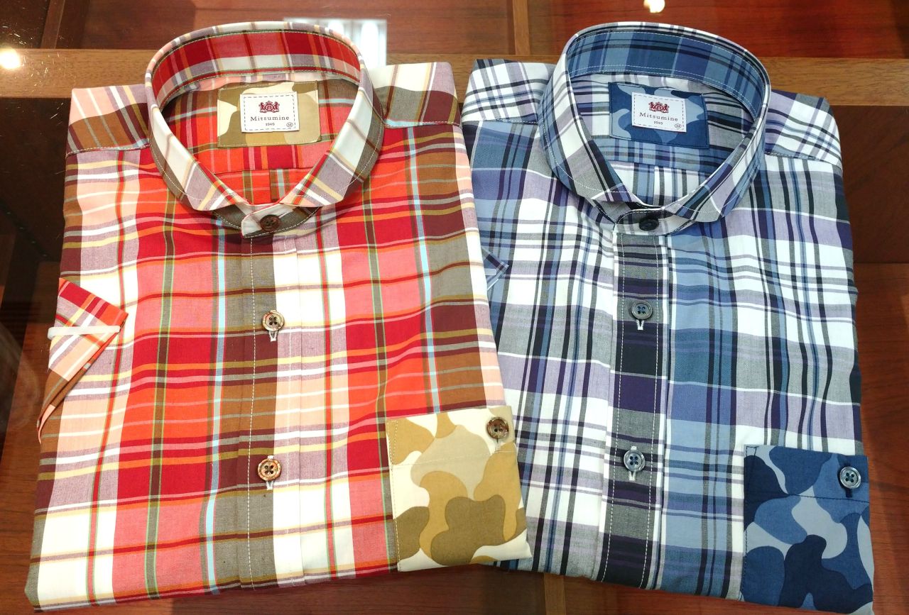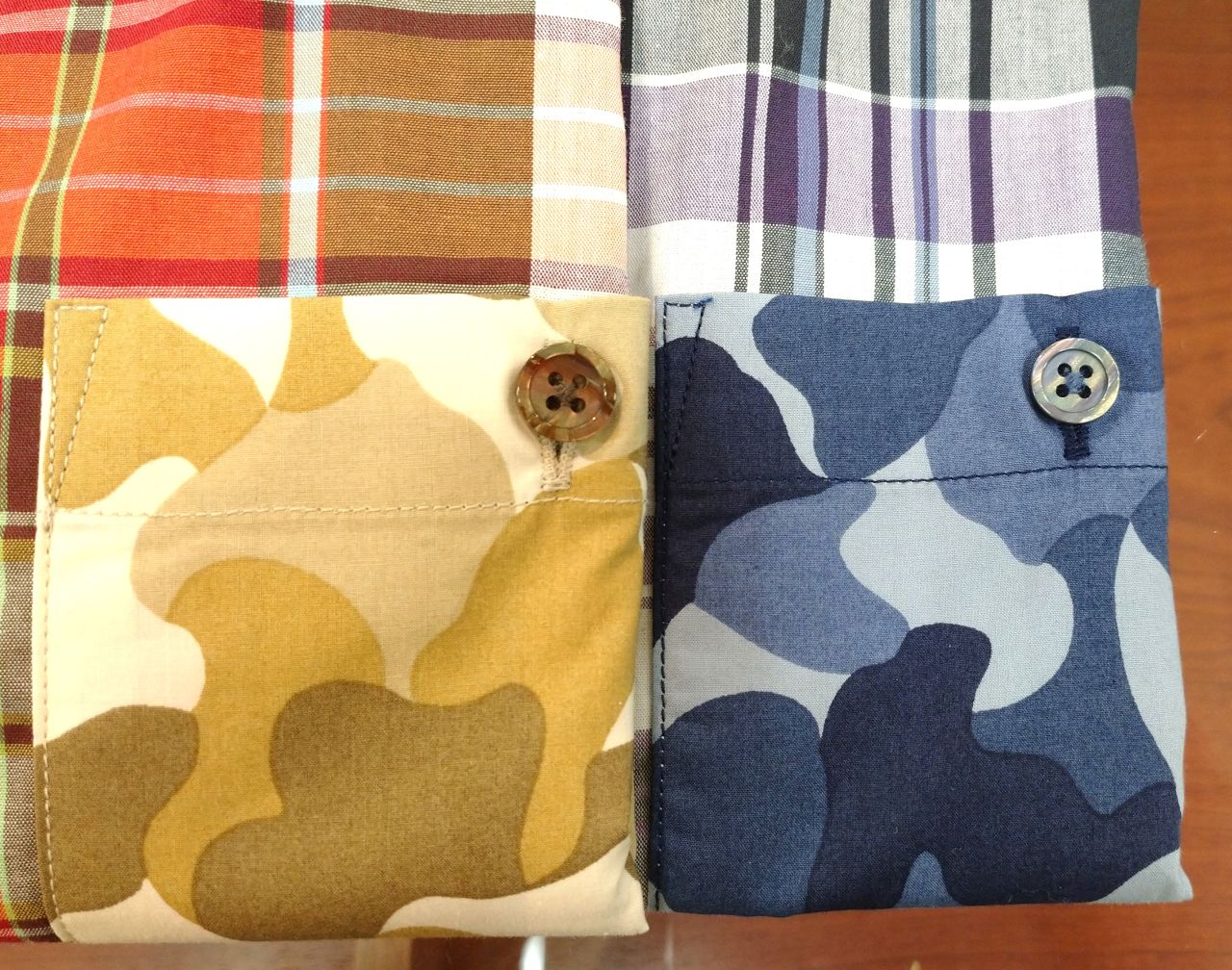 コットン100%のマドラスチェックに、カモフラージュ柄の別布をワンポイントで施した、