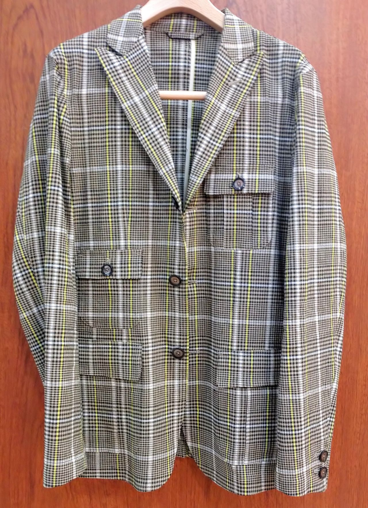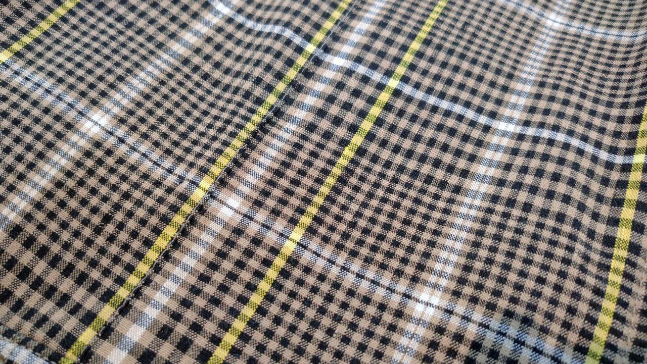 はっきりとしたチェックに、イエローとホワイトのラインがアクセントになった個性的な柄で、