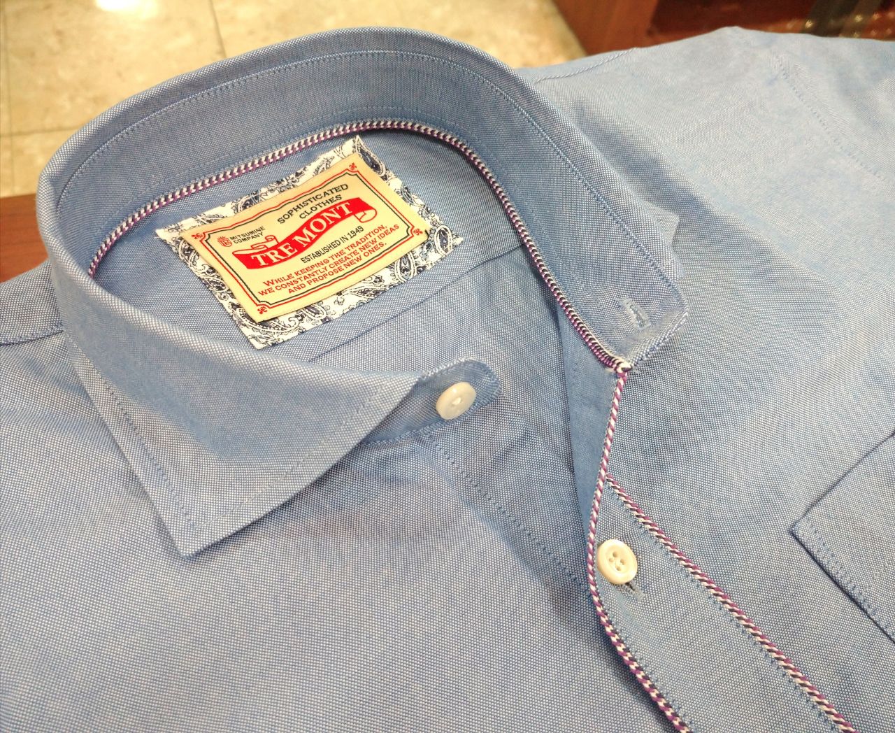 表前立てや襟の内側に施されたパイピングがポイントになっております。
