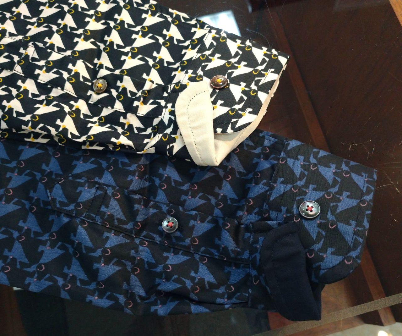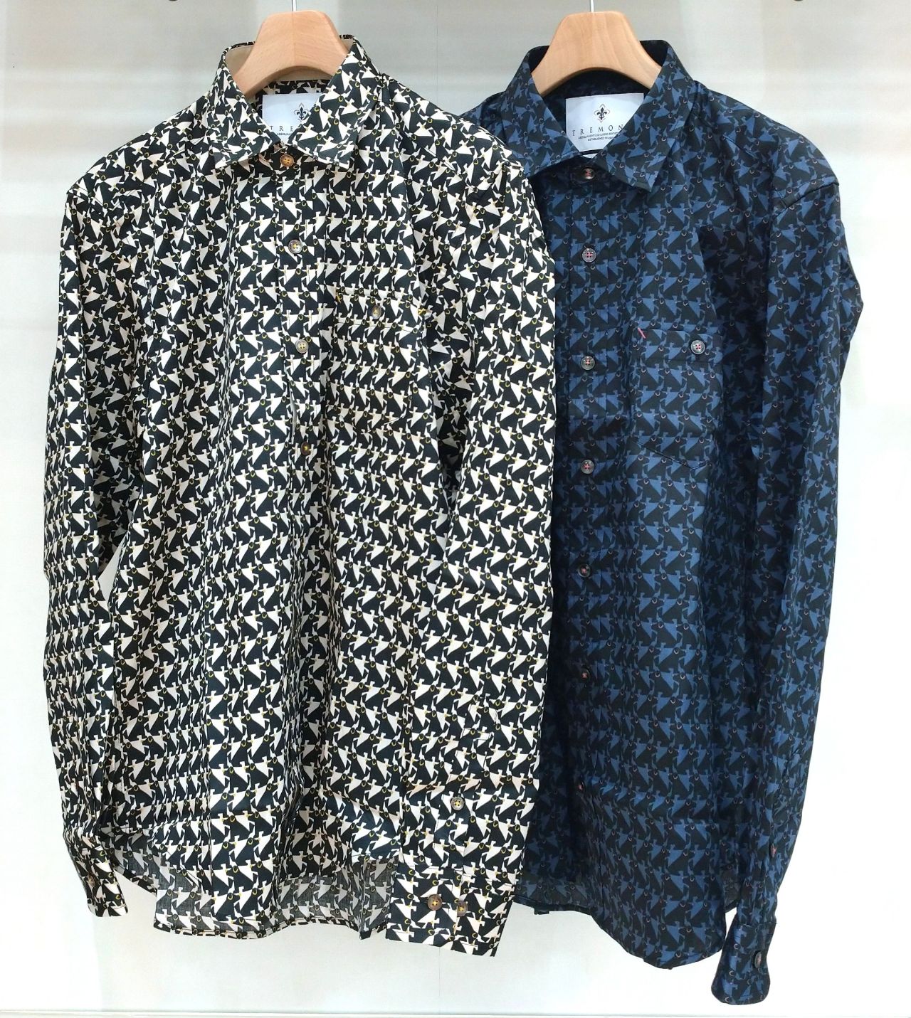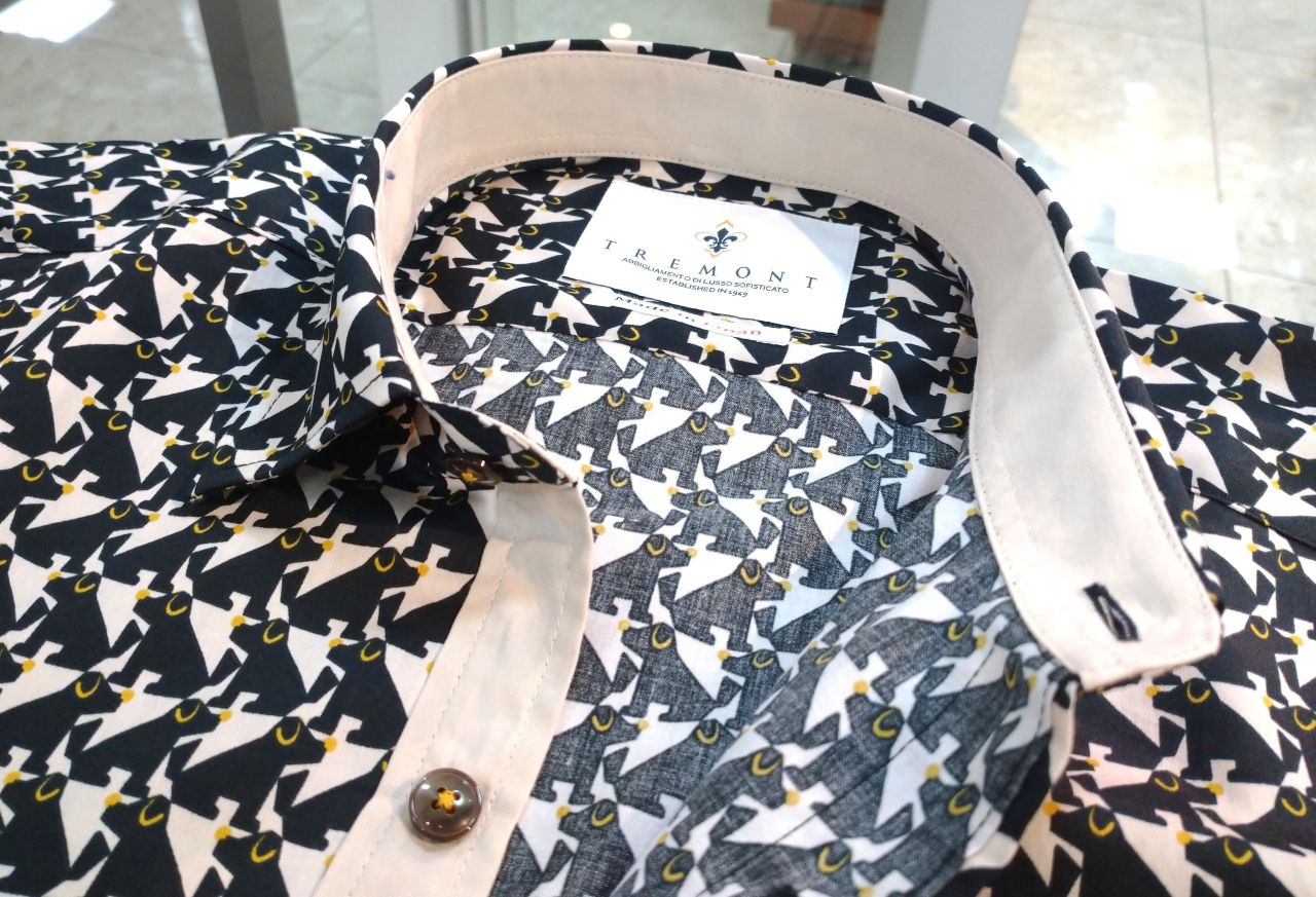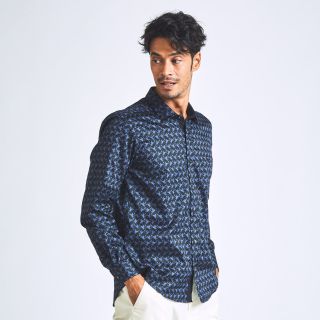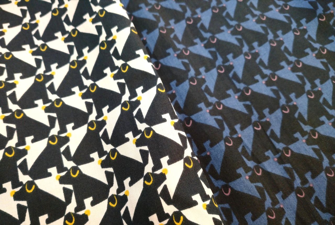 幾何学模様のように見える犬の総柄プリントが特徴的な一枚です。