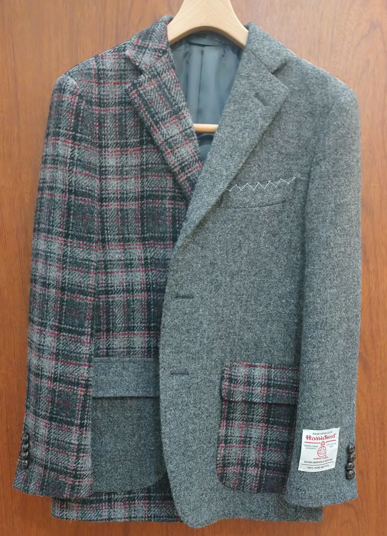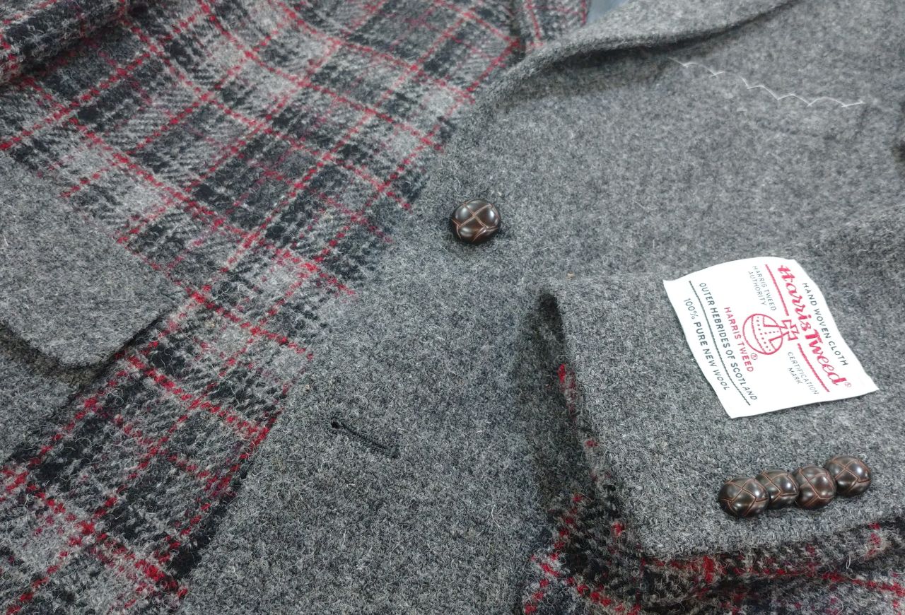 チェック柄と無地のハリスツイードを使用したデザイン性の高いこちらのジャケットは、