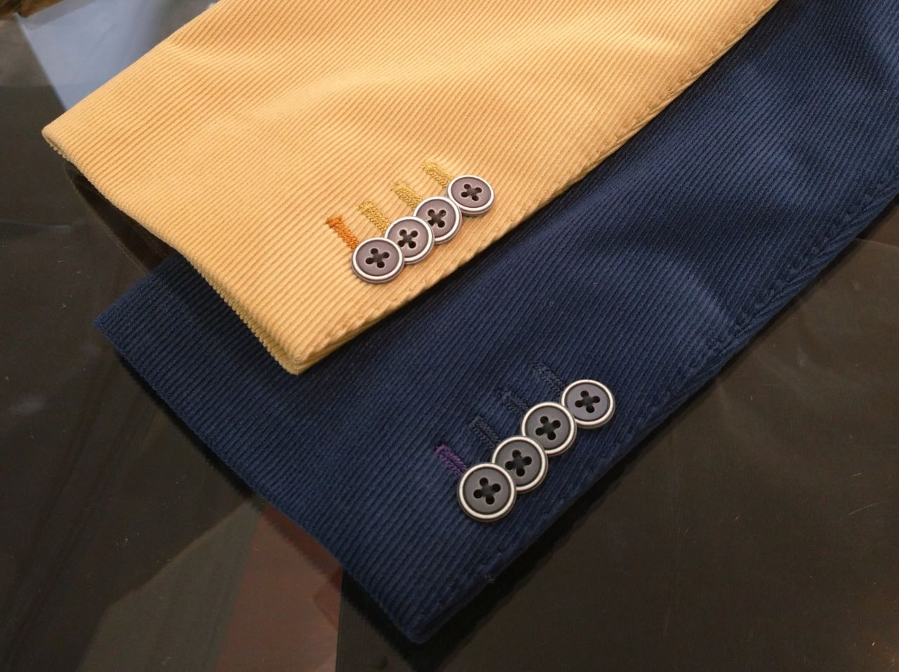 ボタンホールの色糸や、白い縁取りのボタンがポイントです。