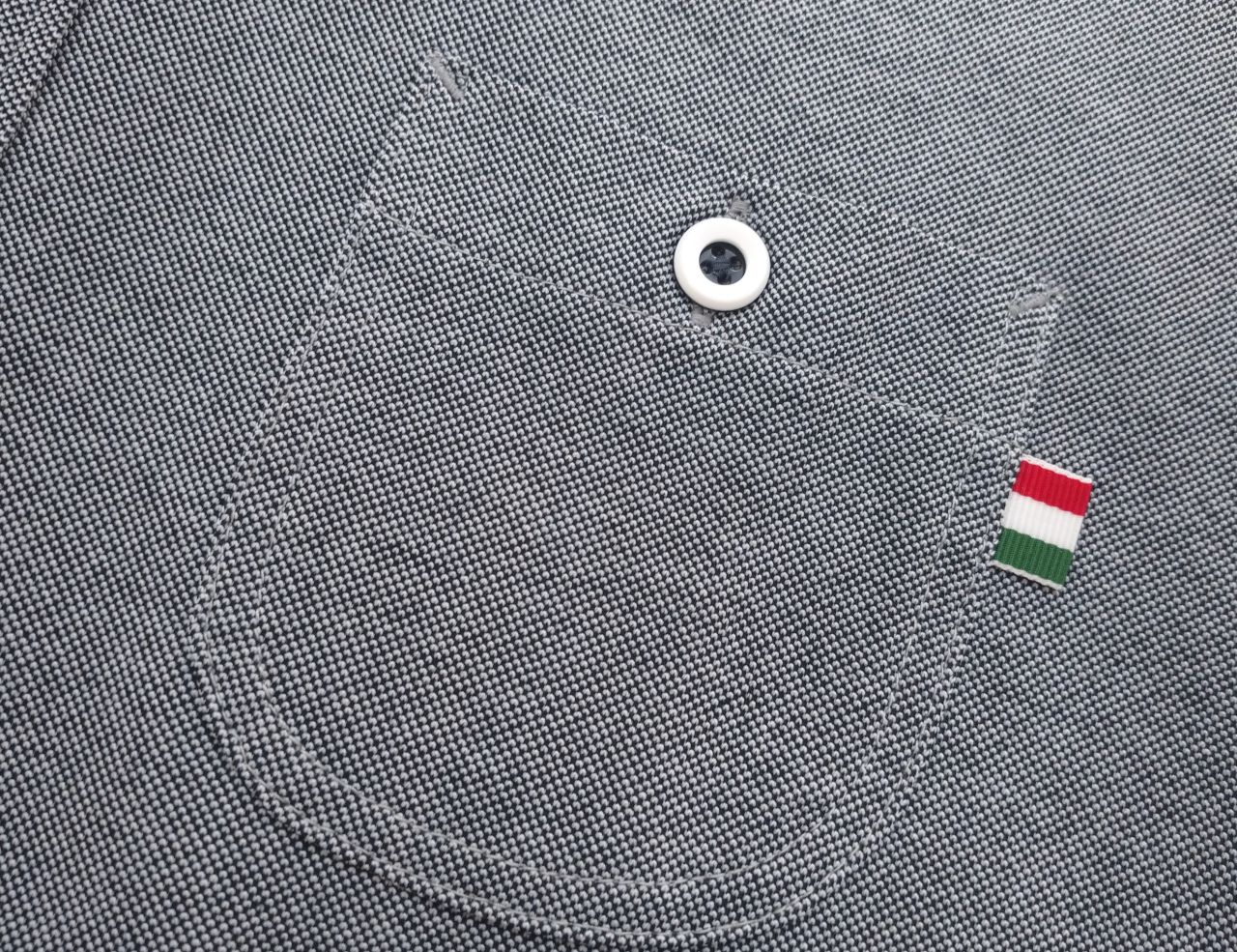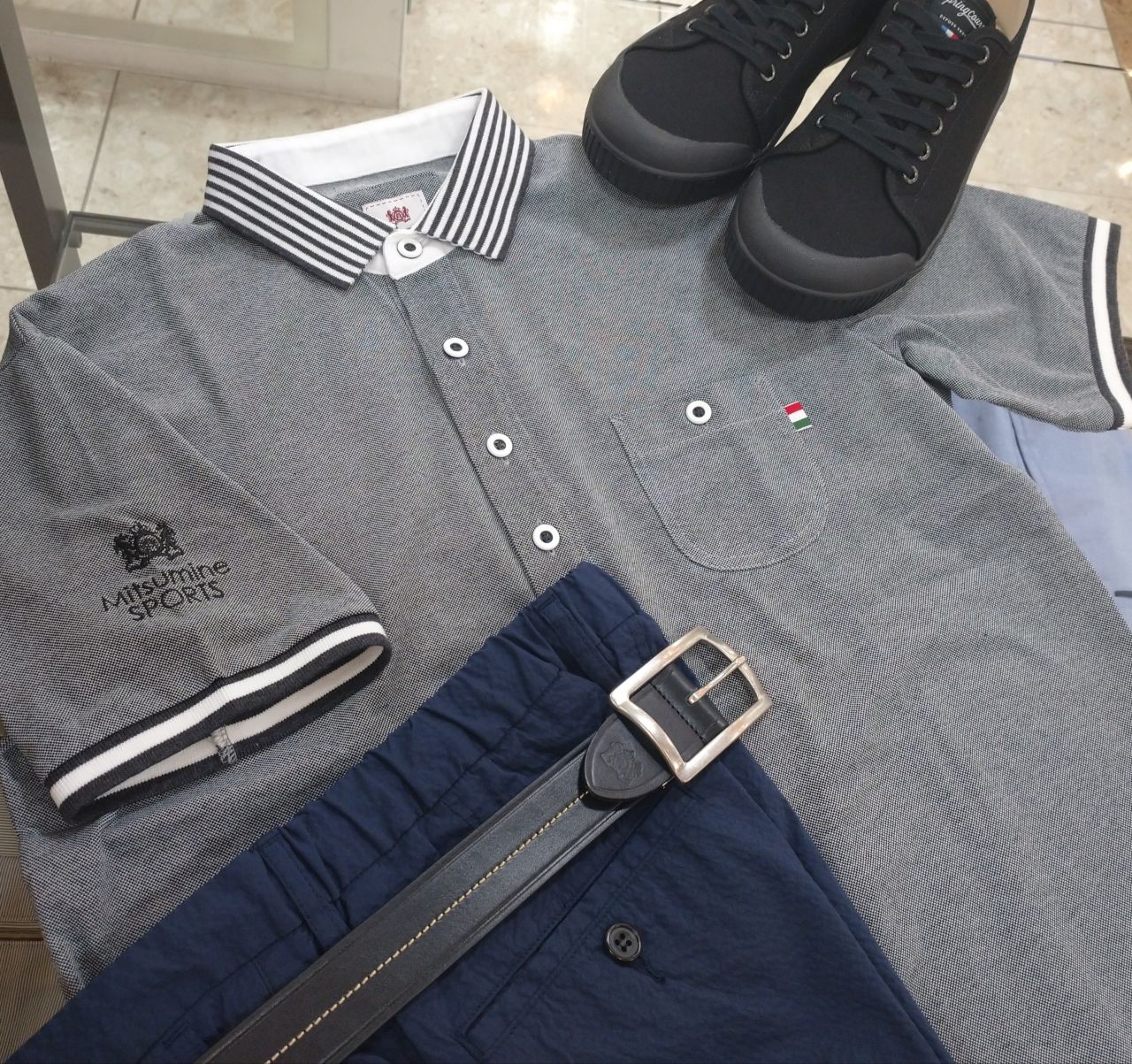グレーのポロシャツを使い、モノトーンカラーを基調にまとめてみました。