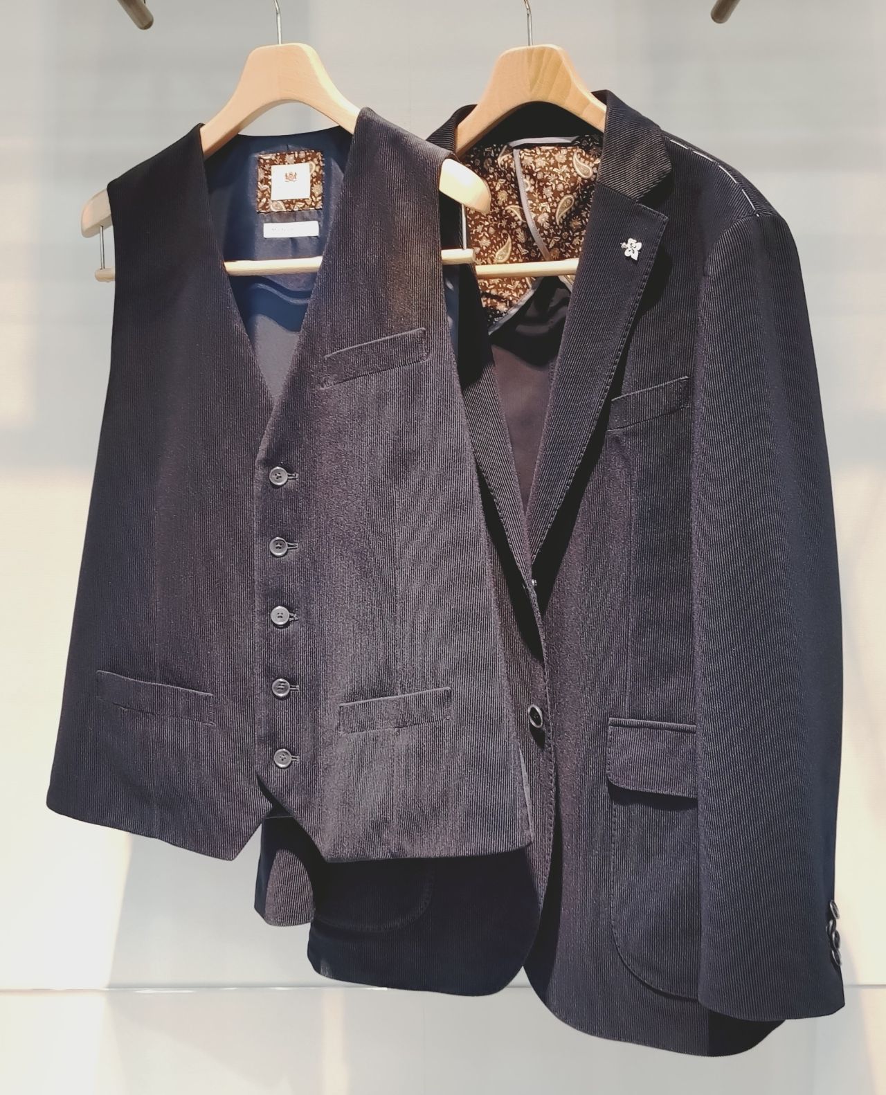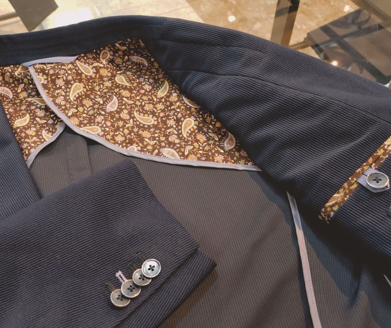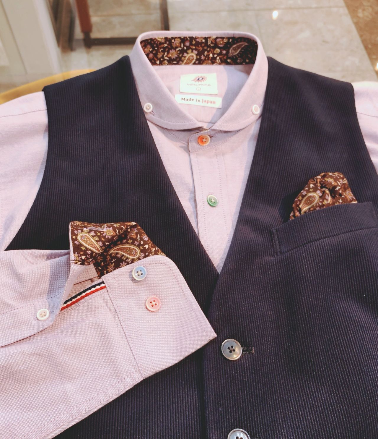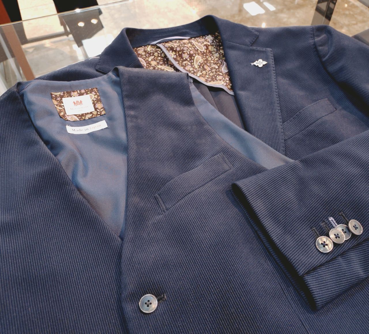 ジャケットのポケットチーフ(裏地)と同じ生地を使った