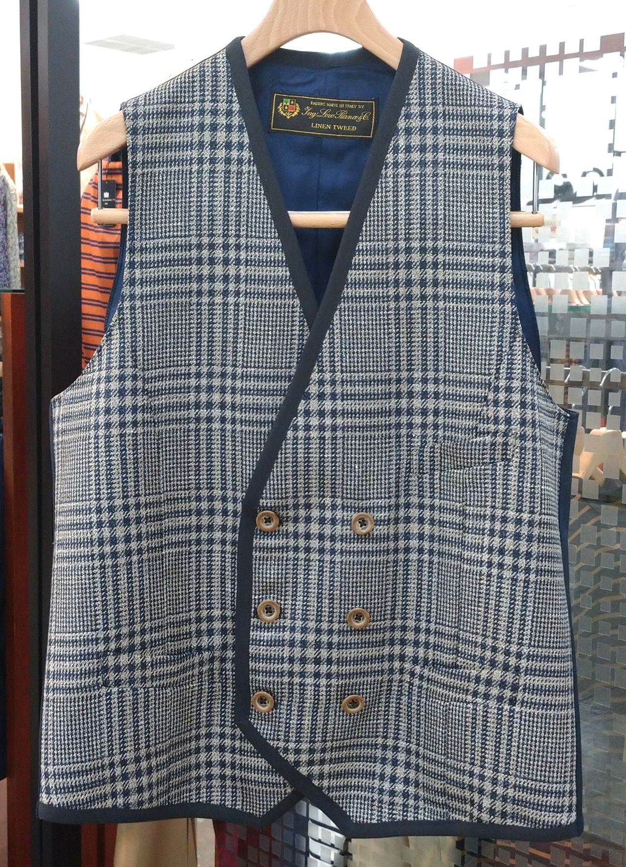 こんな感じに白のフレンチリネンシャツと、ネイビーのショールカラーダブルベストを合せています☆