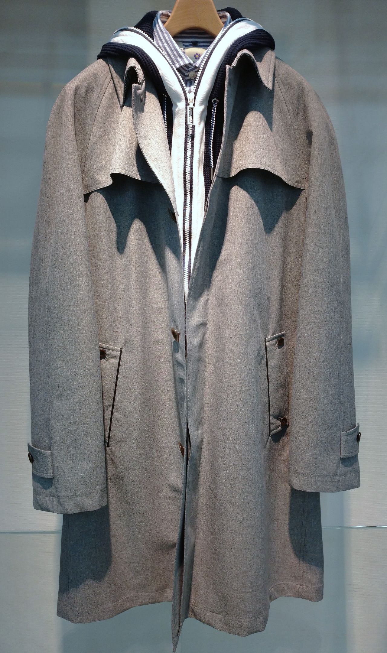ステンカラーコート(グレー)に、ネイビーのワッフルパーカーを合わせて