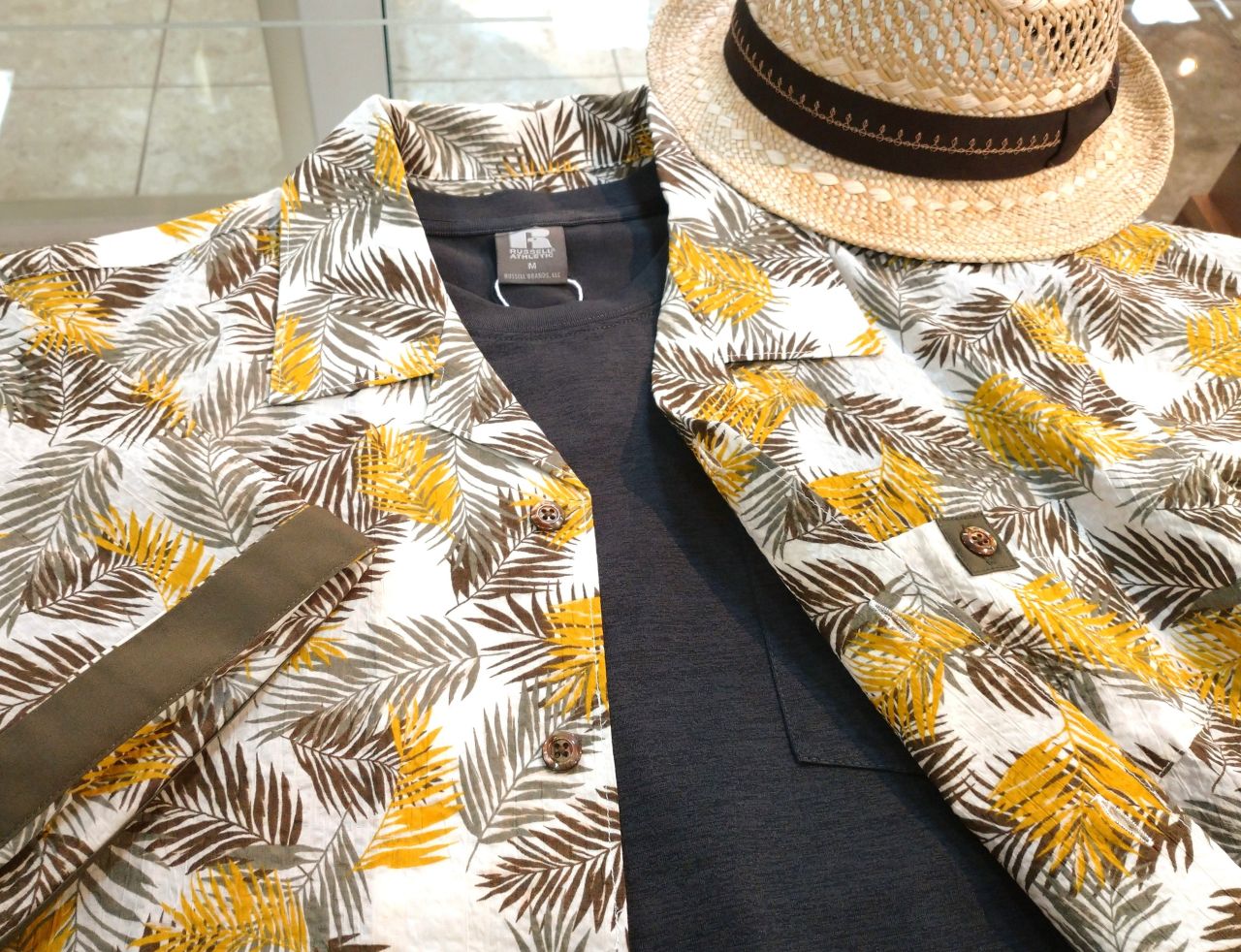シンプルなので華やかなプリントシャツを合わせても良いですね。