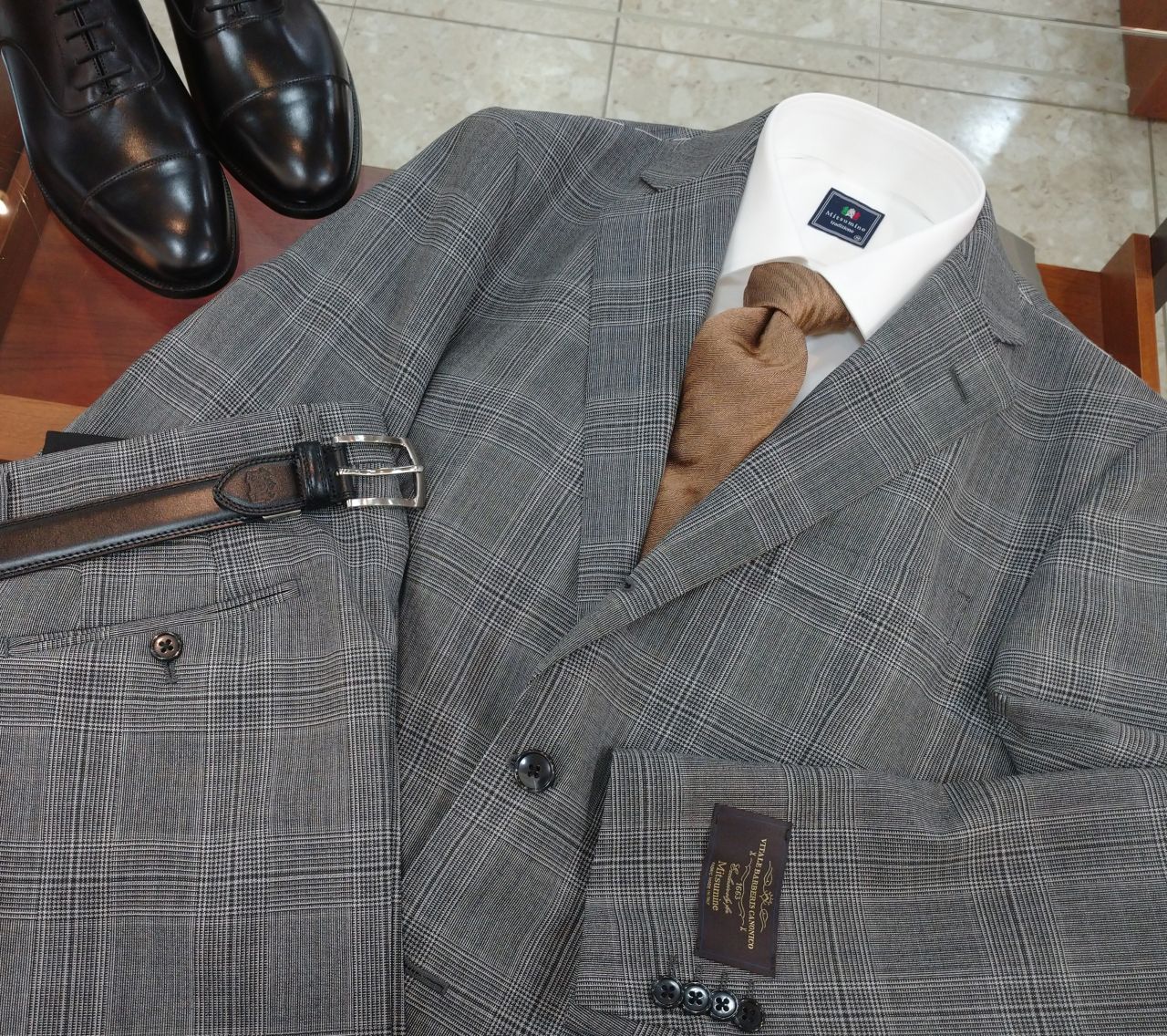 グレンチェックのスーツにも合わせてみました。