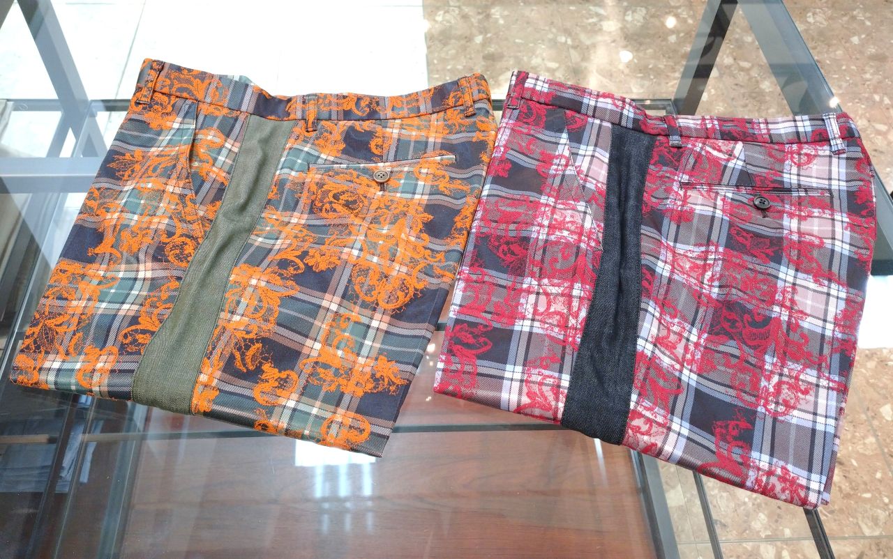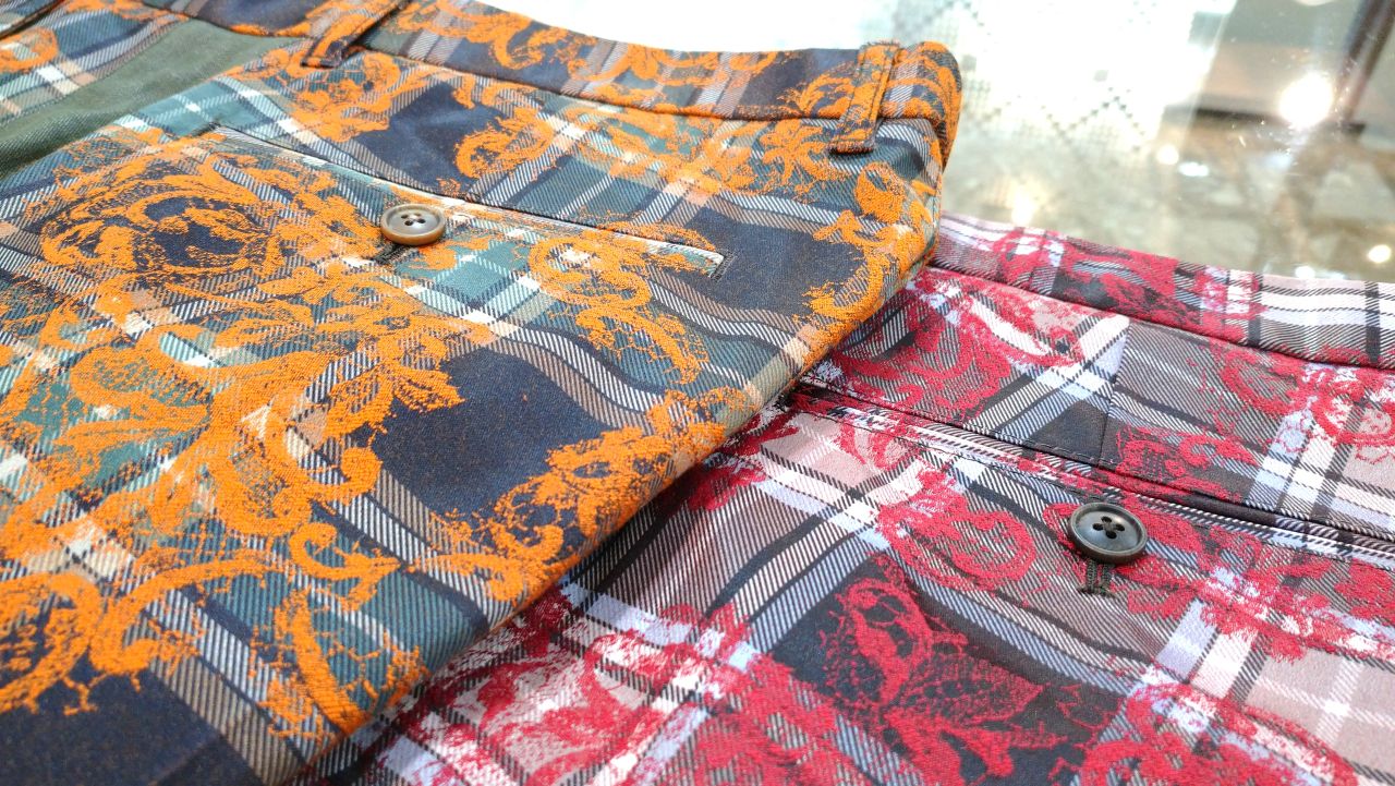 チェックの上に植物のような柄が織られた個性的な生地を使用したショーツです♪