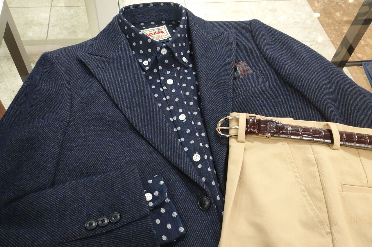 カルゼ無地ニットジャケット(ネイビー)と、ワンプリーツのチノパン(ベージュ)を合わせてみました。