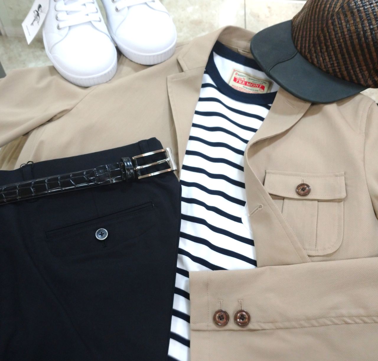 ボーダーのTシャツに、ベージュのシャツジャケットを合わせました。