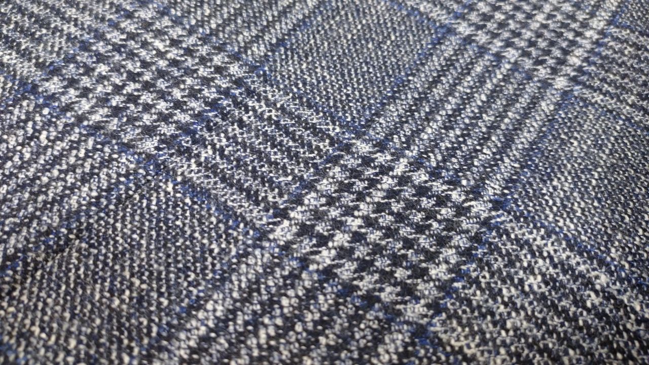 発色の良いブルーのラインがポイントになった、杢糸使いのグレンチェックを使用しています!