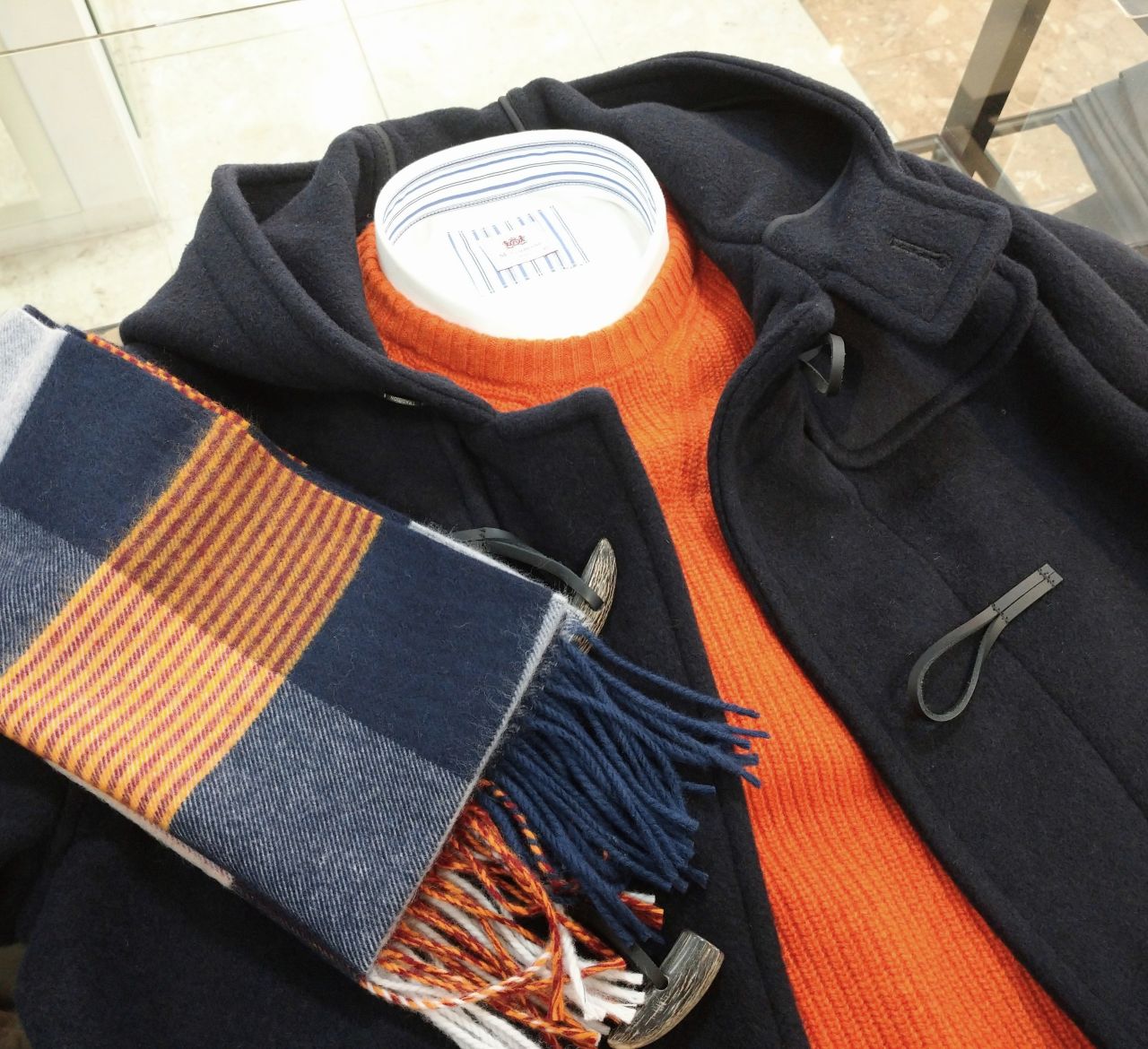 差し色にピッタリなオレンジはダッフルコートに合わせたり、