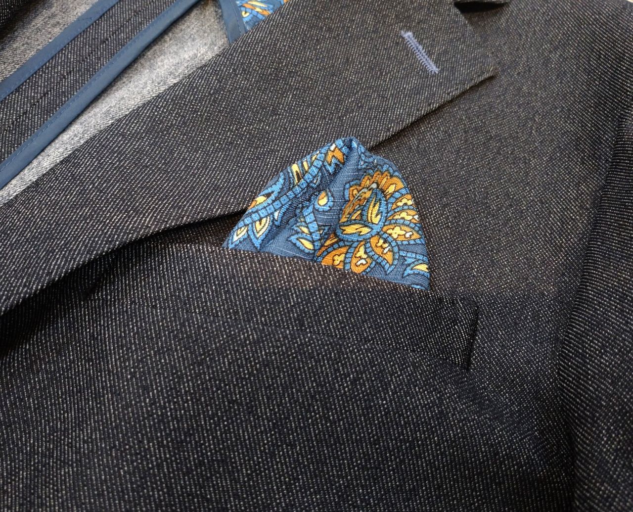 ネイビーのジャガードネクタイをシンプルに合わせたり、