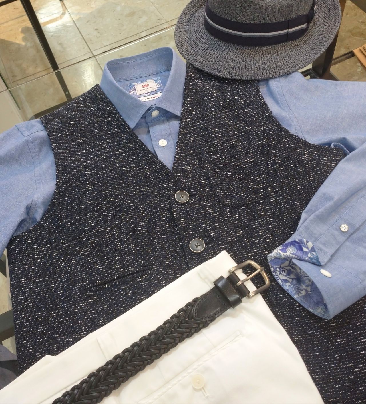 ベストの素材感が引き立つように、無地のカジュアルシャツを合わせて
