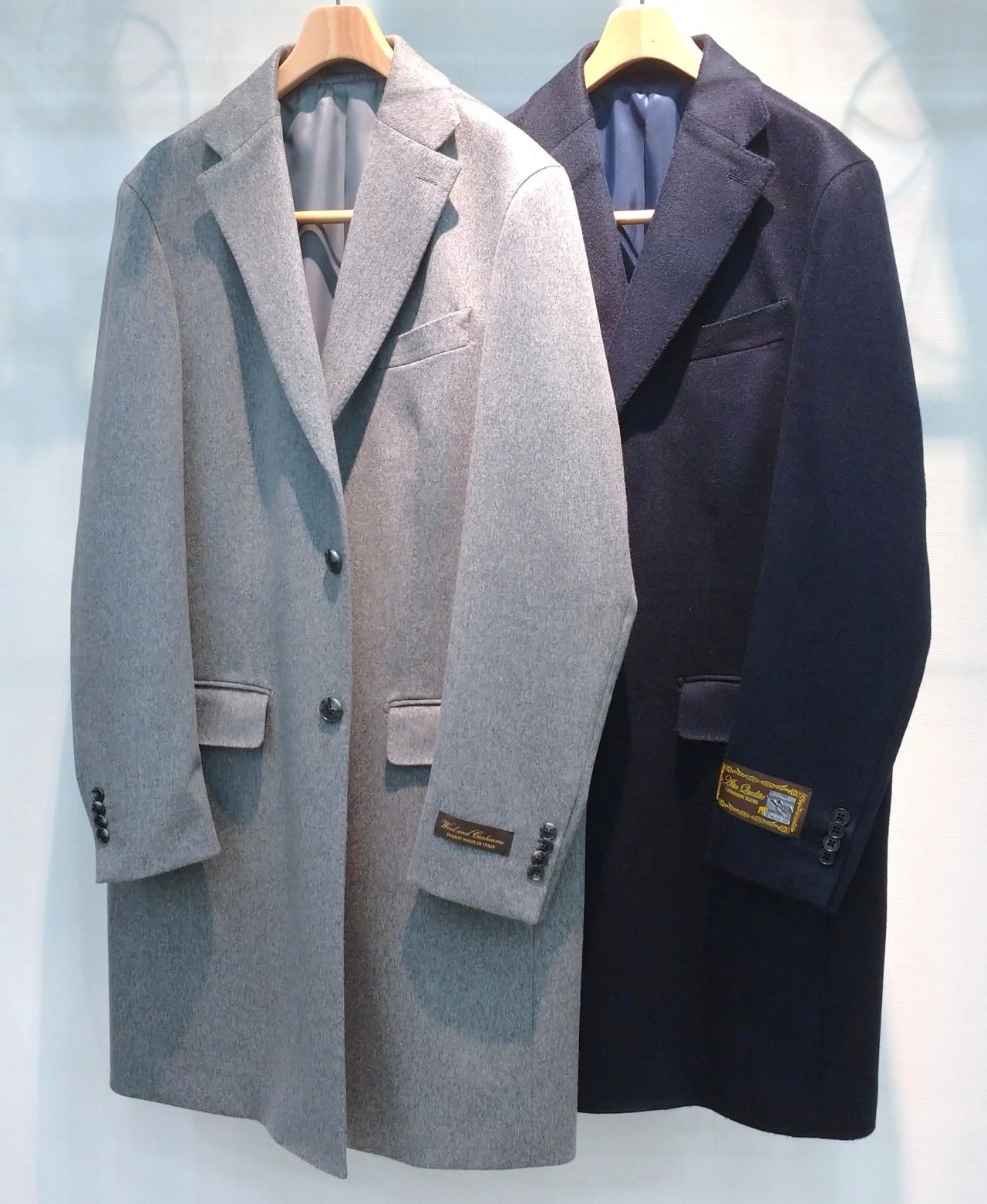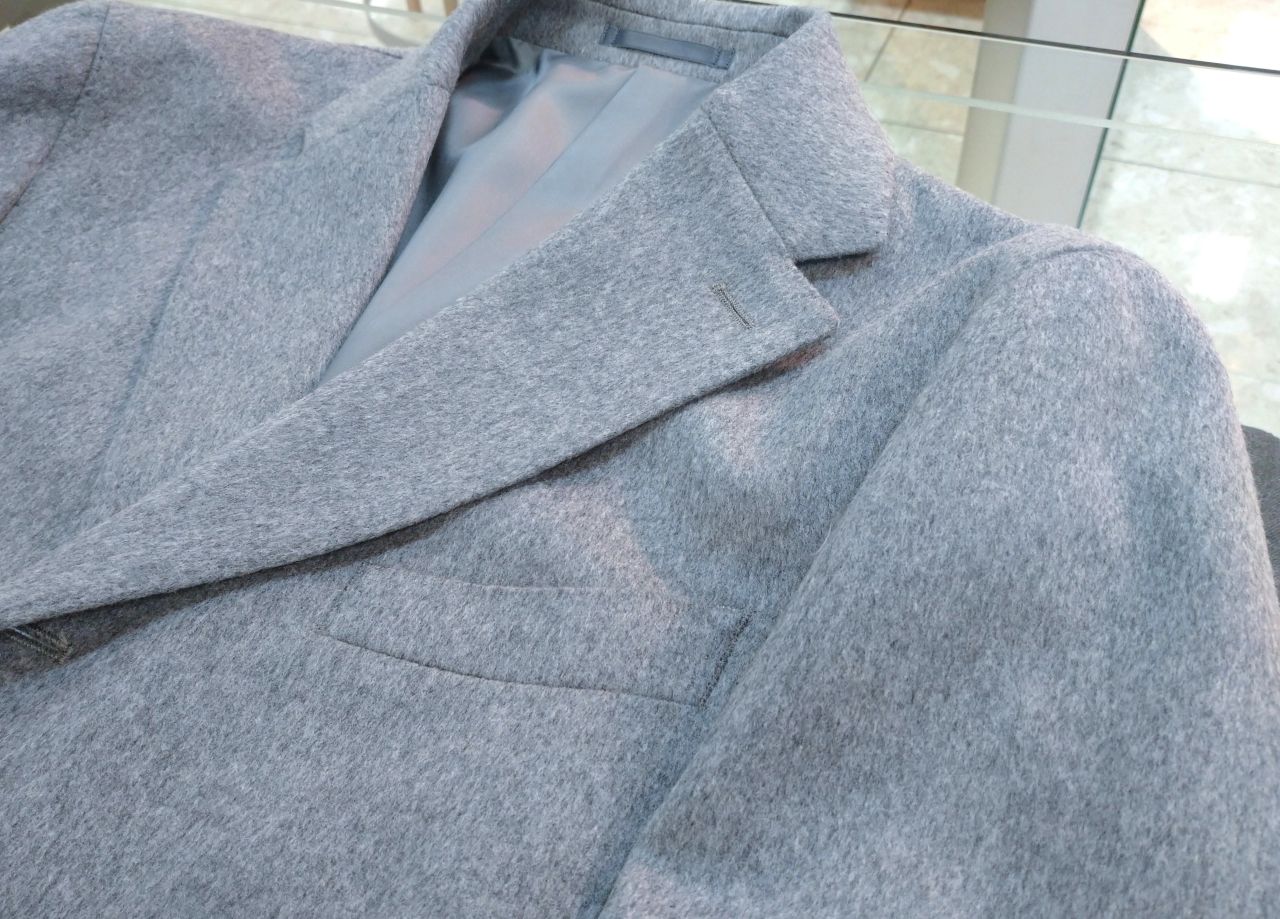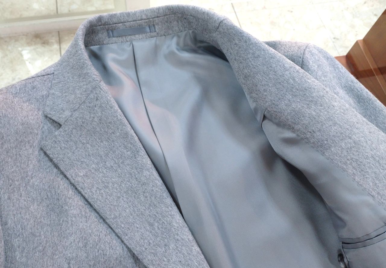 グレー、ネイビーどちらもウールにカシミヤを混紡した素材で、