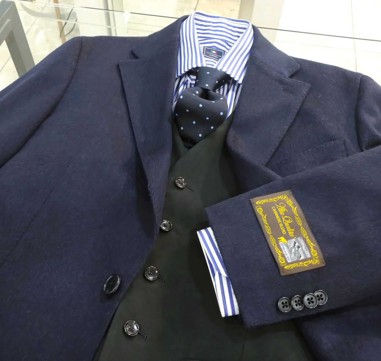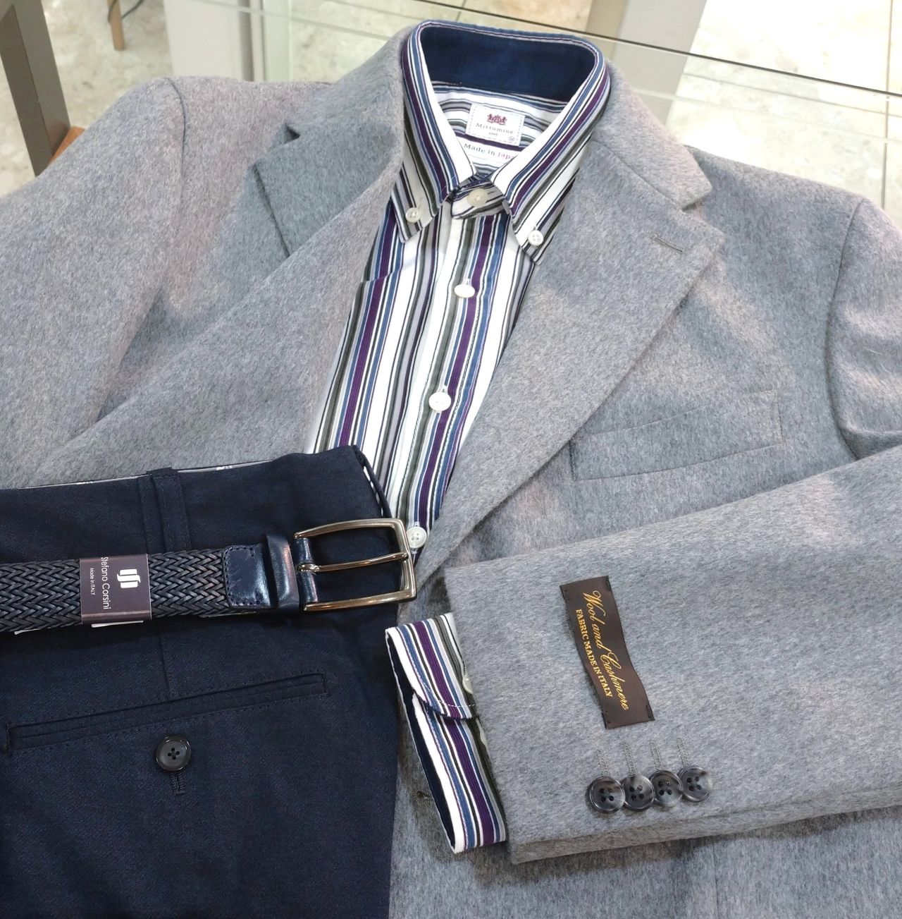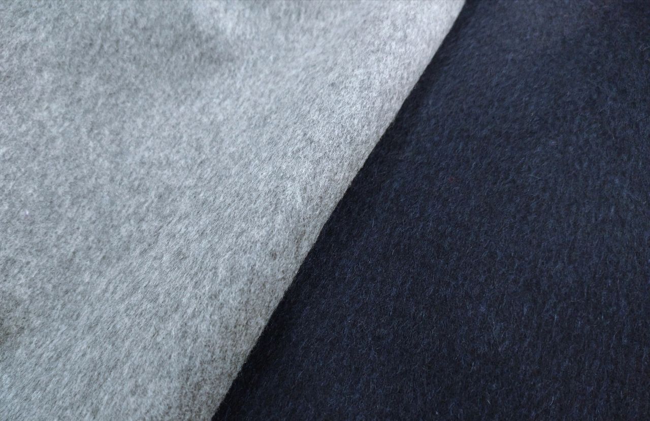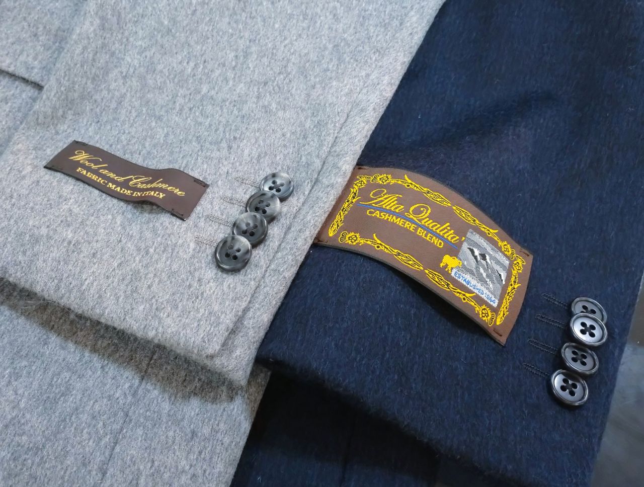 グレー、ネイビーどちらもウールにカシミヤを混紡した素材で、